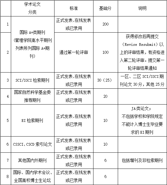 (10)对于所发表的上表中所列的第7、8类论文(其他国内外期刊、国际会议、国内学术会议、全国博士论坛),不论发几篇,均只按总计1篇(6分)计算分值增量。