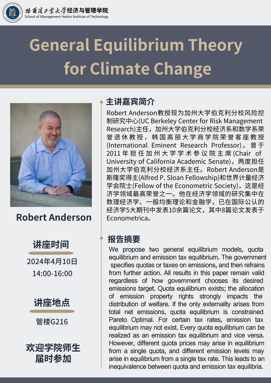 Anderson教授现为加州大学伯克利分校风险控制研究中心(UC Berkeley Center for Risk Management Research)主任,加州大学伯克利分校经济系和数学系荣誉退休教授,韩国高丽大学商体育app 荣誉客座教授(International Eminent Research Professor)。曾于2011年担任加州大学学术参议院主席(Chair of University of California Academic Senate),两度担任加州大学伯克利分校经济系主任。Robert Anderson是斯隆奖得主(Alfred P. Sloan Fellowship)和世界计量经济学会院士(Fellow of the Econometric Society),这是经济学领域最高荣誉之一。他在经济学领域的研究集中在数理经济学、一般均衡理论和金融学,已在国际公认的经济学5大期刊中发表10余篇论文,其中8篇论文发表于Econometrica