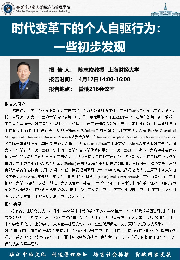 【讲座通知】4月17日上海财经大学陈志俊教授讲座通知