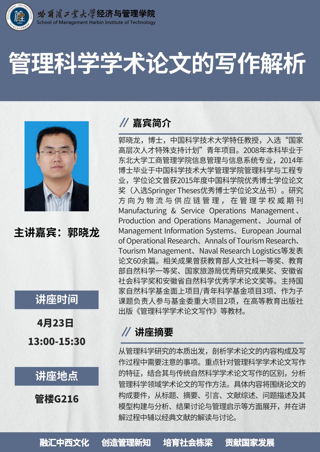 从管理科学研究的本质出发,剖析学术论文的内容构成及写作过程中需要注意的事项。重点针对管理科学学术论文写作的特征,结合其与传统自然科学学术论文写作的区别,分析管理科学领域学术论文的写作方法。具体内容将围绕论文的构成要件,从标题、摘要、引言、文献综述、问题描述及其模型构建与分析、结果讨论与管理启示等方面展开,并在讲解过程中辅以经典文献的解读与讨论。