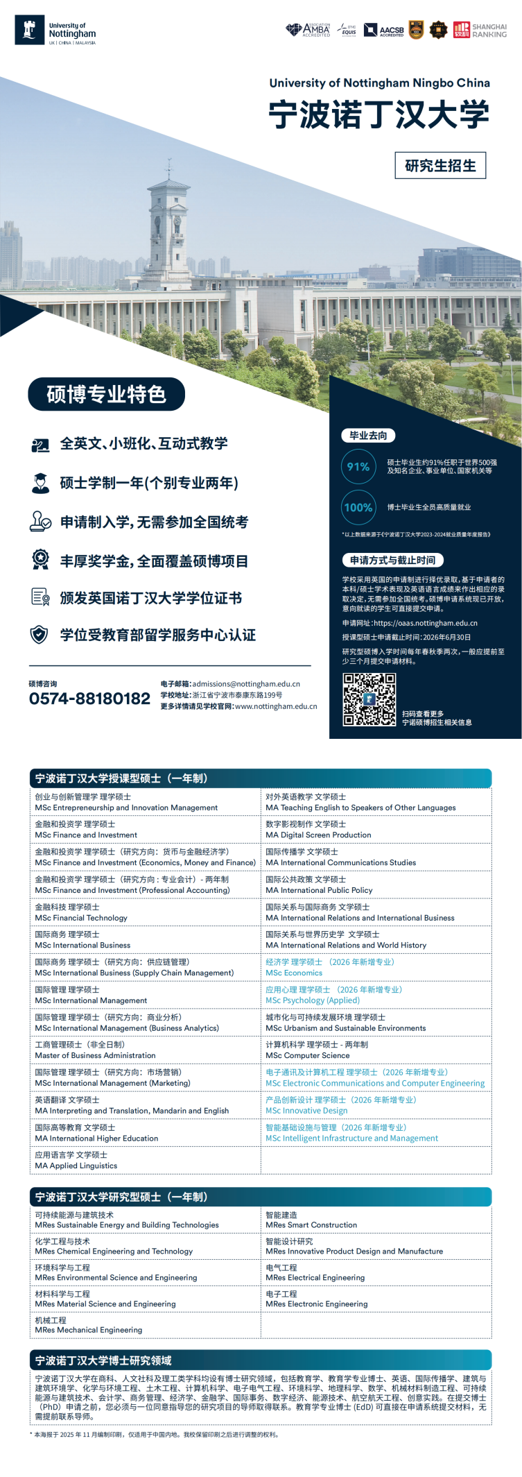 实施提升深造率专项行动,现举办“经心远航”宁波诺丁汉大学(2026QS世界大学排名中,位列世界第97位)研究生招生专场宣讲会。本次宣讲会旨在通过拓展同学们的升学深造视野,为同学们提供更丰富的升学深造选择。宣讲会具体安排通知如下。