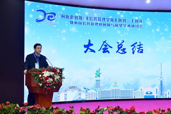 院长孙涛教授作大会总结。他指出,《公共管理学报》在引领我国公共管理研究的理论、方法和学科建设上具有前瞻性,学报与我国公共管理学科形成了同频共振和双向赋能的关系。孙涛教授祝贺《公共管理学报》创刊20周年,并感谢全国公共管理学界同仁参与此次研讨会,期待未来《公共管理学报》能进一步推进公共管理学科的交流互鉴和学术繁荣。