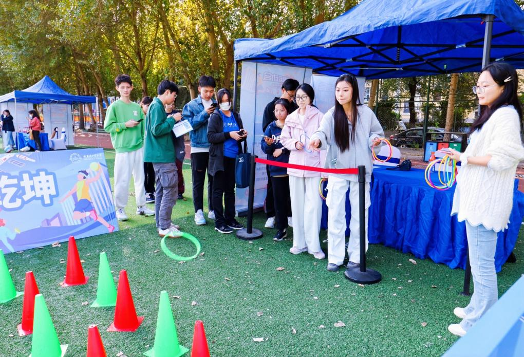 本次活动形式多样,共设置了八个趣味运动点位,每个点位均包含基础任务和加成任务,“一‘掷’乾坤”要求选手精准投中红锥桶,而“一‘鸣’惊人”则考验选手夹核桃的技巧和音量控制能力。在“一触即‘发’”射门环节,同学们展现了出色的射门技术,投篮环节也同样让大家的运动技能得到了充分发挥。这些环节不仅考验了参赛者的运动能力,也增强了活动的趣味性和互动性。经过激烈地角逐,活动最终决出了一、二、三等奖,并在活动结束后进行了颁奖仪式。