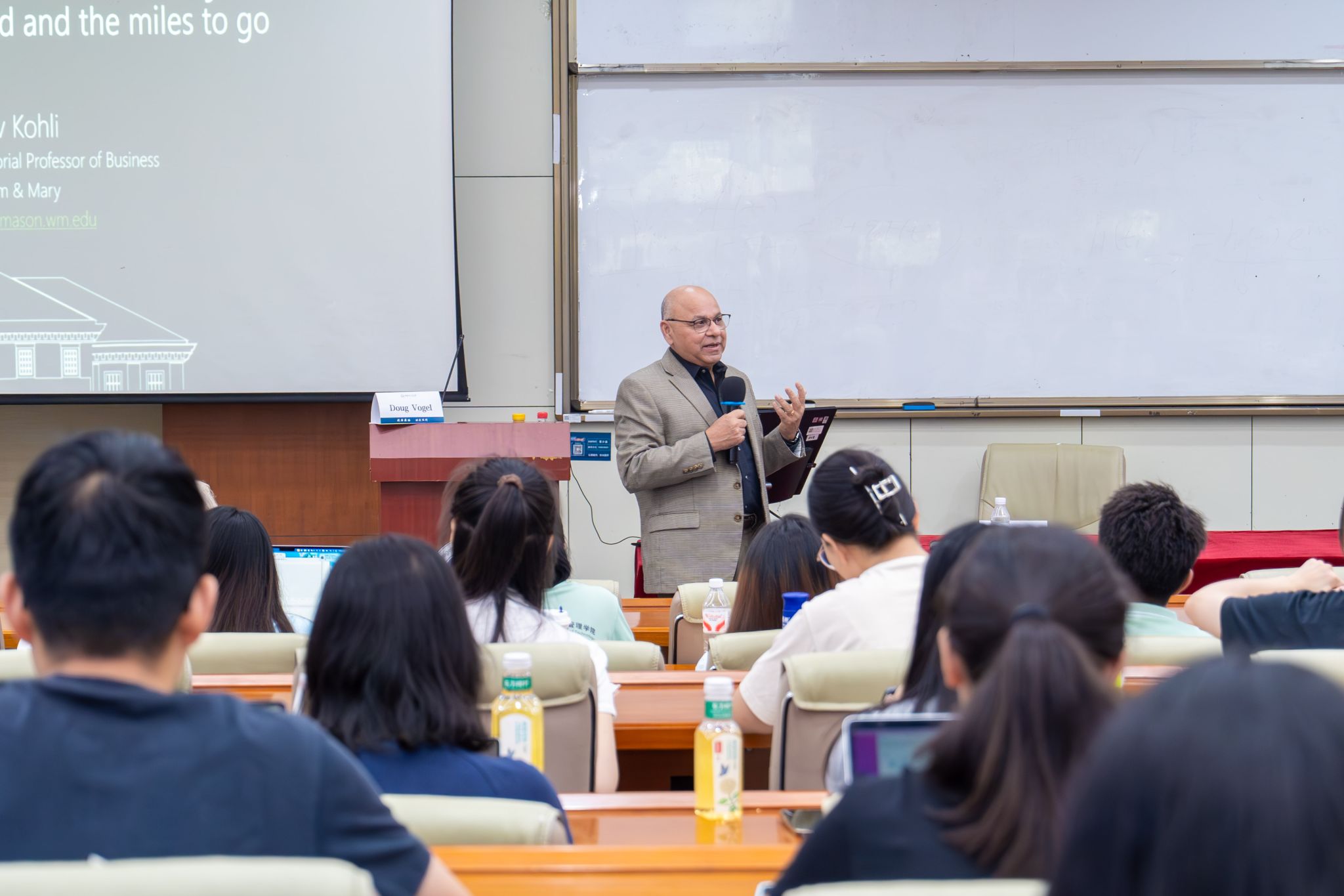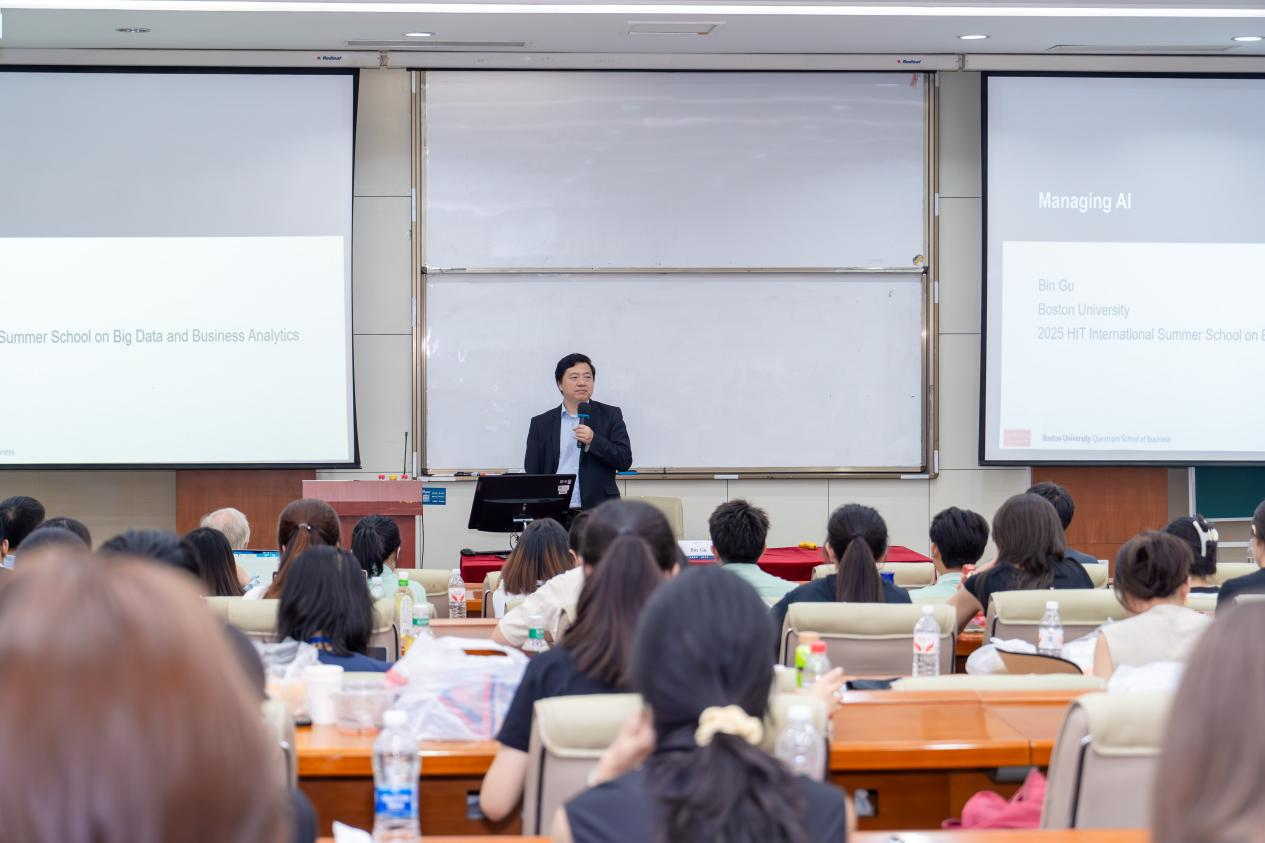 信息系统系主任Bin Gu教授代表授课教师致辞。他肯定了本次夏校的学术深度与国际视野,赞赏哈工大为全球青年学者搭建起“跨学科、跨文化、跨领域”的思想交流平台。他表示,期待未来与更多来自中国与世界各地的学生在数据与商业分析的前沿继续同行。