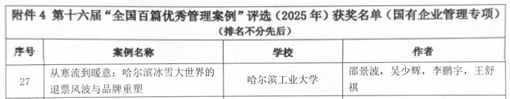 邵景波教授、吴少辉研究员、李鹏宇助理研究员、博士研究生王舒祺共同开发的案例《从寒流到暖意:哈尔滨冰雪大世界的退票风波与品牌重塑》入选“全国百篇优秀管理案例(国有企业管理专项)”。