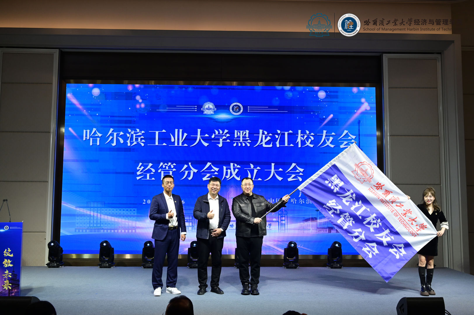 成立大会现场,选举通过《哈尔滨工业大学黑龙江校友会经管分会章程》及哈尔滨工业大学黑龙江校友会经管分会组织成员名单。张旭为哈尔滨工业大学黑龙江校友会经管分会授旗,同时为黑龙江校友会经管分会执行会长王笑卓,秘书长沈久迪、闫佳旭颁发聘书。杨春雷、白杨、张旭、王笑卓和闫佳旭共同参加启动仪式。哈尔滨工业大学教育发展基金会秘书长白杨到场祝贺哈尔滨工业大学黑龙江校友会经管分会成立。