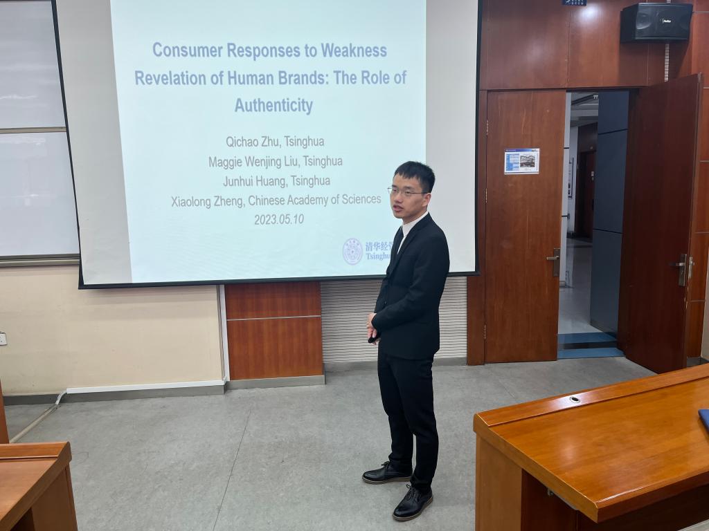 朱启超博士在讲座中介绍了品牌营销的不同模式,并就暴露缺点的品牌会如何影响消费者进行了探讨。以自身研究为例,从研究背景、理论假设、实验设计等方面进行了介绍,并根据自身实证研究结果对如何管理个人品牌提出建议。报告结束后,参会师生就实证研究对象选取、个人品牌塑造等问题展开了深入探讨。