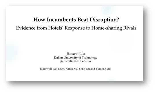 2023年5月19日,应市场营销系邀请,大连理工大学刘建伟副教授在线作了题为《How Incumbents Beat Disruption? Evidence from Hotel Responses to Home Sharing》的讲座,讲座由市场营销系张紫琼教授主持。