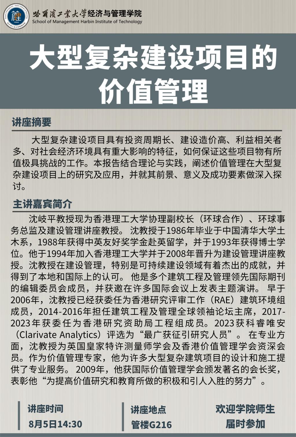 沈岐平教授现为香港理工大学协理副校长(环球合作)、环球事务总监及建设管理讲座教授。 沈教授于1986年毕业于中国清华大学土木系,1988年获得中英友好奖学金赴英留学,并于1993年获得博士学位。他于1994年加入香港理工大学并于2008年晋升为建设管理讲座教授。沈教授在建设管理,特别是可持续建设领域有着杰出的成就,并得到了本地和国际上的认可。 他是多个建筑工程及管理领先国际期刊的编辑委员会成员,并获邀在许多国际会议上发表主题演讲。 早于2006年,沈教授已经获委任为香港研究评审工作(RAE)建筑环境组成员,2014-2016年担任建筑工程及管理全球领袖论坛主席,2017-2023年获委任为香港研究资助局工程组成员。2023获科睿唯安(Clarivate Analytics)评选为“最广获征引研究人员”。 在专业方面,沈教授为英国皇家特许测量师学会及香港价值管理学会资深会员。作为价值管理专家,他为许多大型复杂建筑项目的设计和施工提供了专业服务。 2009年,他获国际价值管理学会颁发著名的会长奖,表彰他“为提高价值研究和教育所做的积极和引人入胜的努力”。