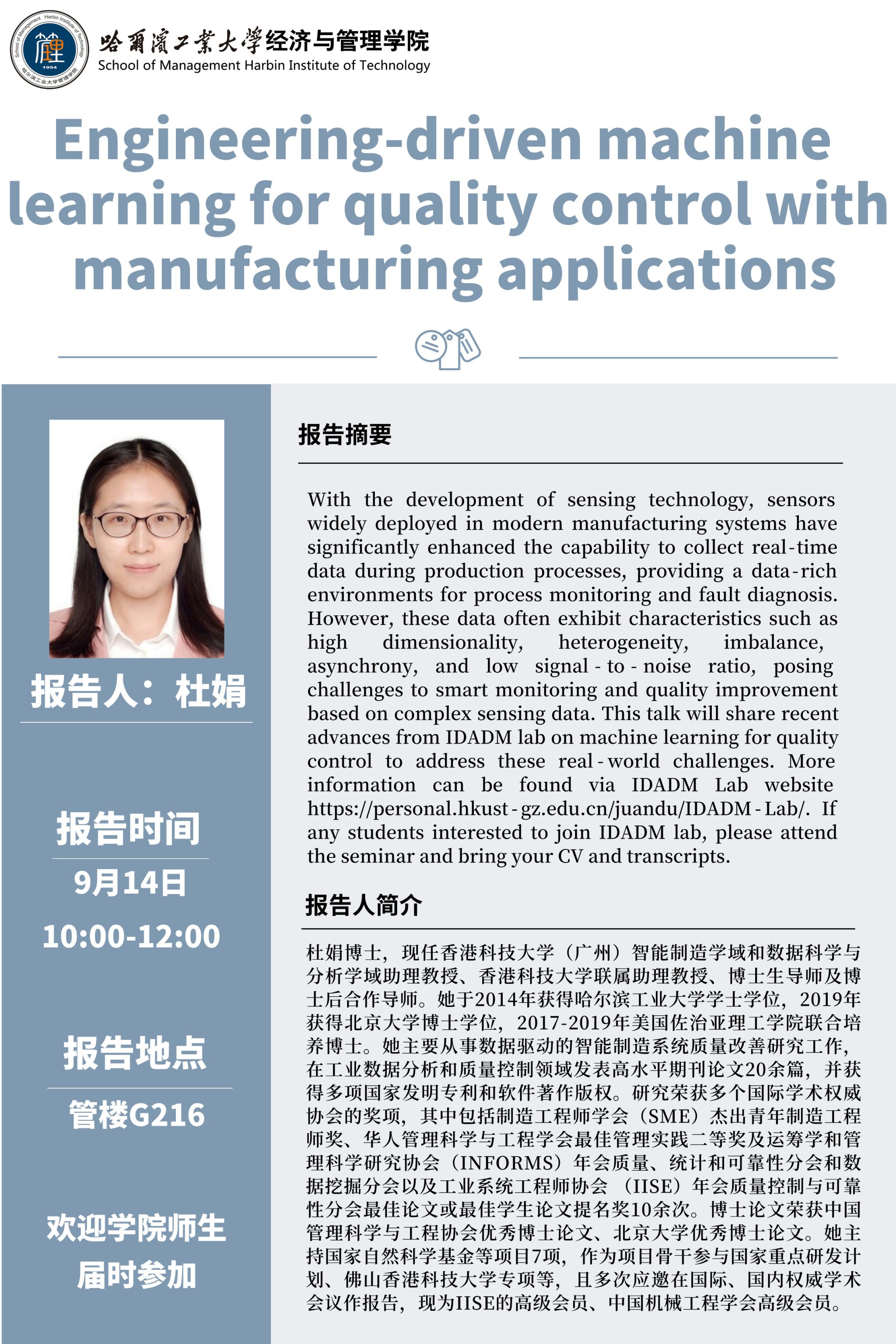 With the development of sensing technology, sensors widely deployed in modern manufacturing systems have significantly enhanced the capability to collect real-time data during production processes, providing a data-rich environments for process monitoring and fault diagnosis. However, these data often exhibit characteristics such as high dimensionality, heterogeneity, imbalance, asynchrony, and low signal-to-noise ratio, posing challenges to smart monitoring and quality improvement based on complex sensing data. This talk will share recent advances from IDADM lab on machine learning for quality control to address these real-world challenges. More information can be found via IDADM Lab website //personal.hkust-gz.edu.cn/juandu/IDADM-Lab/. If any students interested to join IDADM lab, please attend the seminar and bring your CV and transcripts.