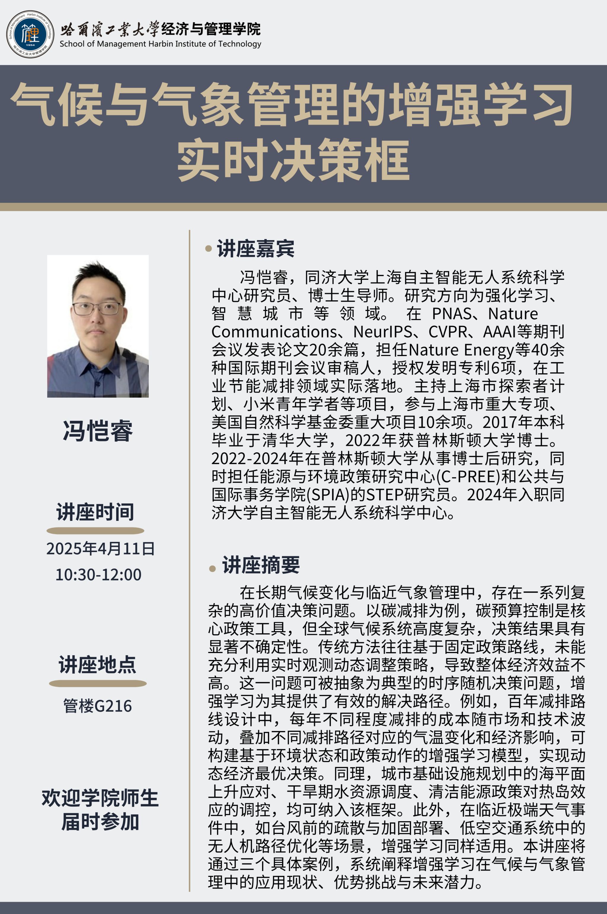 在长期气候变化与临近气象管理中,存在一系列复杂的高价值决策问题。以碳减排为例,碳预算控制是核心政策工具,但全球气候系统高度复杂,决策结果具有显著不确定性。传统方法往往基于固定政策路线,未能充分利用实时观测动态调整策略,导致整体经济效益不高。这一问题可被抽象为典型的时序随机决策问题,增强学习为其提供了有效的解决路径。例如,百年减排路线设计中,每年不同程度减排的成本随市场和技术波动,叠加不同减排路径对应的气温变化和经济影响,可构建基于环境状态和政策动作的增强学习模型,实现动态经济最优决策。同理,城市基础设施规划中的海平面上升应对、干旱期水资源调度、清洁能源政策对热岛效应的调控,均可纳入该框架。此外,在临近极端天气事件中,如台风前的疏散与加固部署、低空交通系统中的无人机路径优化等场景,增强学习同样适用。本讲座将通过三个具体案例,系统阐释增强学习在气候与气象管理中的应用现状、优势挑战与未来潜力。