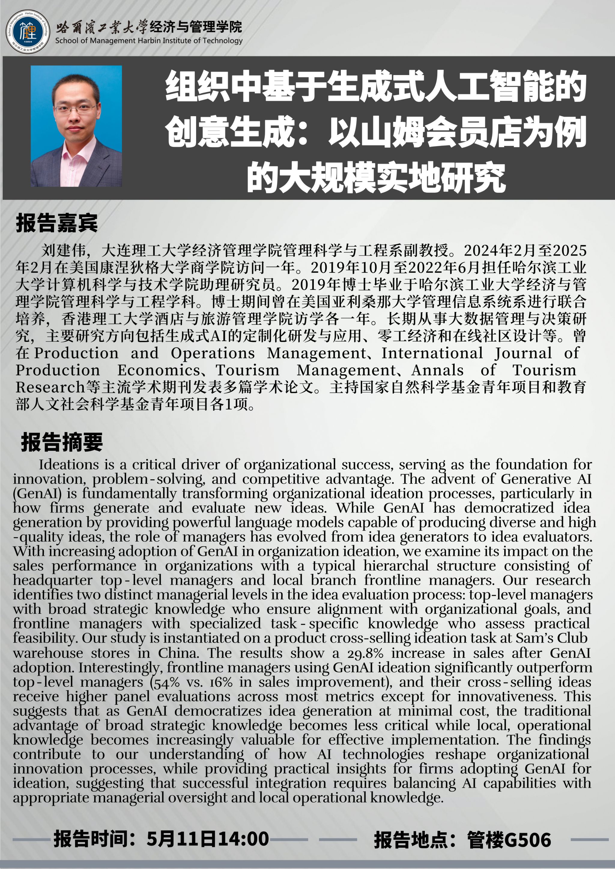 讲座主题:组织中基于生成式人工智能的创意生成:以山姆会员店为例的大规模实地研究