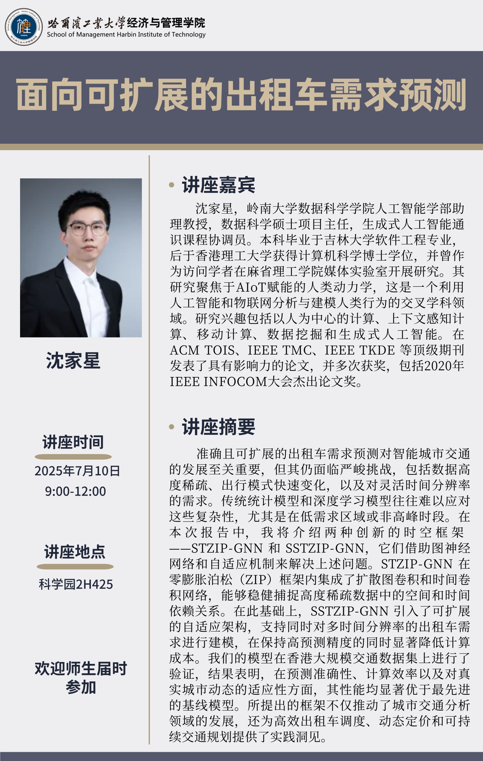 准确且可扩展的出租车需求预测对智能城市交通的发展至关重要,但其仍面临严峻挑战,包括数据高度稀疏、出行模式快速变化,以及对灵活时间分辨率的需求。传统统计模型和深度学习模型往往难以应对这些复杂性,尤其是在低需求区域或非高峰时段。在本次报告中,我将介绍两种创新的时空框架 ——STZIP-GNN SSTZIP-GNN,它们借助图神经网络和自适应机制来解决上述问题。STZIP-GNN 在零膨胀泊松(ZIP)框架内集成了扩散图卷积和时间卷积网络,能够稳健捕捉高度稀疏数据中的空间和时间依赖关系。在此基础上,SSTZIP-GNN 引入了可扩展的自适应架构,支持同时对多时间分辨率的出租车需求进行建模,在保持高预测精度的同时显著降低计算成本。我们的模型在香港大规模交通数据集上进行了验证,结果表明,在预测准确性、计算效率以及对真实城市动态的适应性方面,其性能均显著优于最先进的基线模型。所提出的框架不仅推动了城市交通分析领域的发展,还为高效出租车调度、动态定价和可持续交通规划提供了实践洞见。