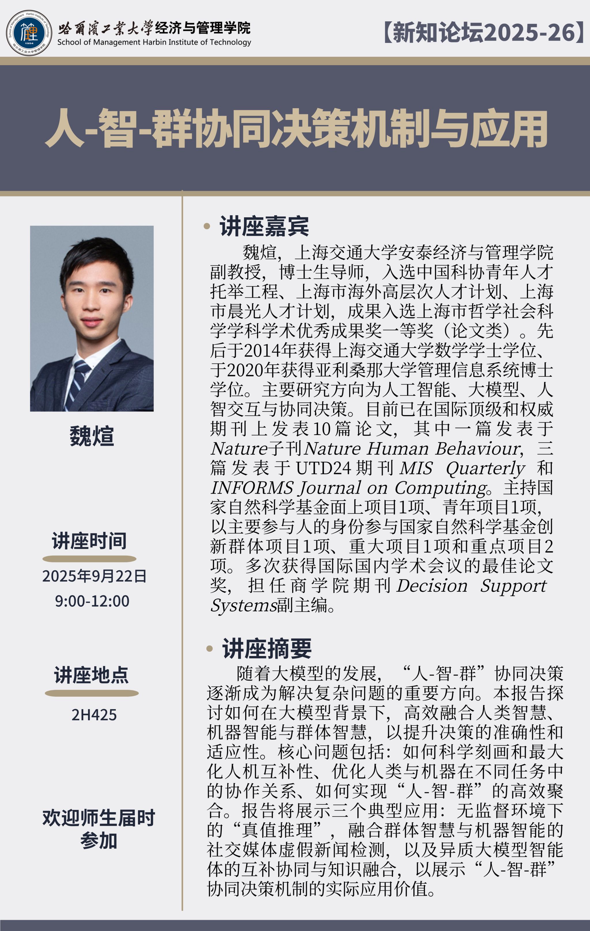 【新知论坛2025-26】9月22日上海交通大学魏煊副教授讲座通知
