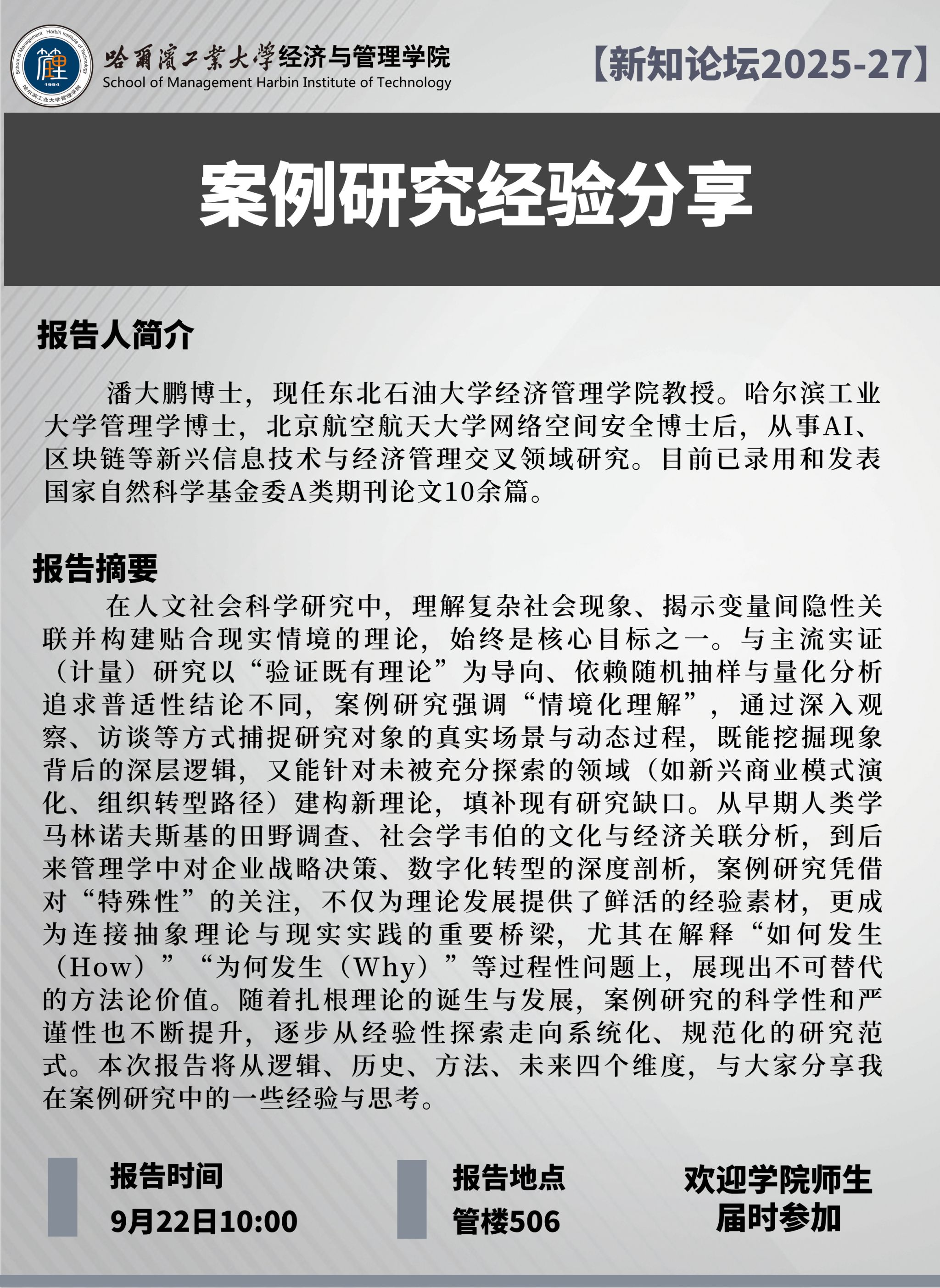 【新知论坛2025-27】9月22日东北石油大学潘大鹏教授讲座通知