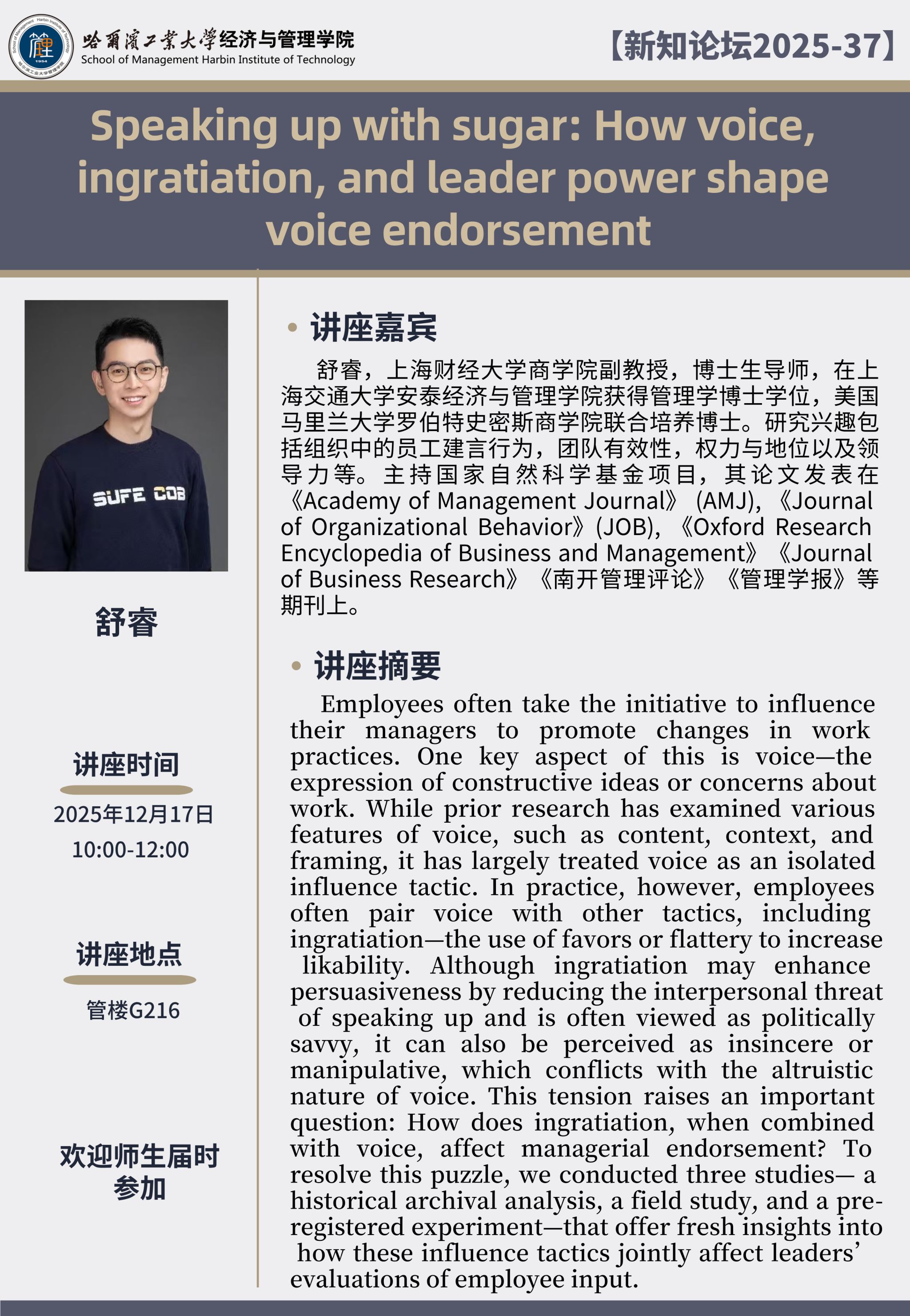 讲座主题:Speaking up with sugar: How voice, ingratiation, and leader power shape voice endorsement