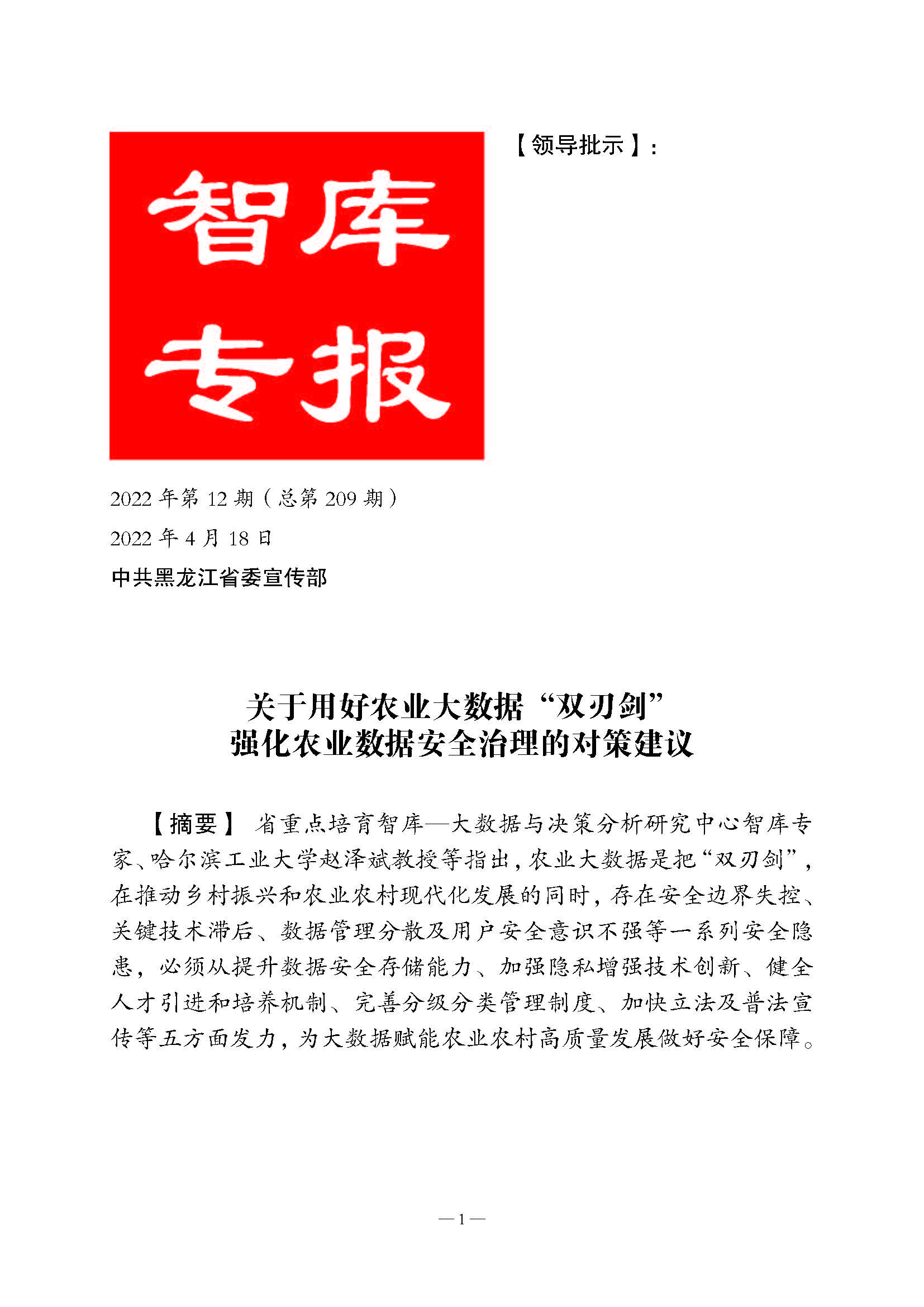 赵泽斌教授、叶强教授《关于用好农业大数据“双刃剑”强化农业数据安全治理的对策建议》收录在黑龙江省委宣传部《智库专报》2022年第12期。文章指出,农业大数据是把“双刃剑”,在推动乡村振兴和农业农村现代化发展的同时,存在安全边界失控、关键技术滞后、数据管理分散及用户安全意识不强等一系列安全隐患,必须从提升数据安全存储能力、加强隐私增强技术创新、健全人才引进和培养机制、完善分级分类管理制度、加快立法及普法宣传等五方面发力,为大数据赋能农业农村高质量发展做好安全保障。