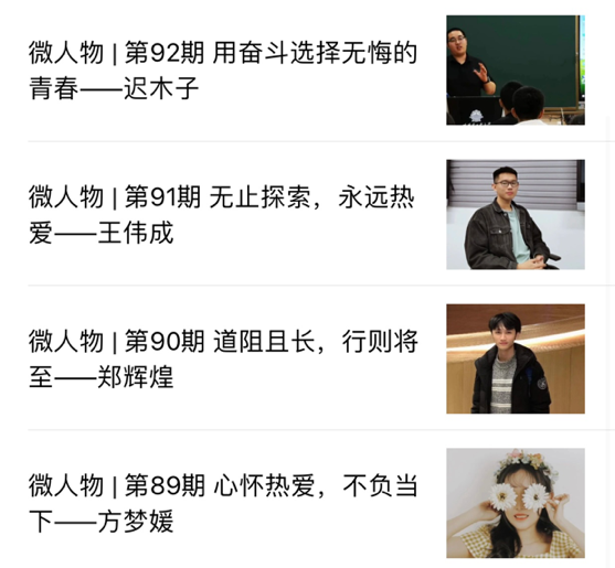 微人物是联络部的品牌活动之一,现已在“HIT经管V时刻”公众号上发表了96期,其中囊括在学生工作、志愿活动、学习成绩、科研竞赛、特长爱好、创新创业等各方面出众的学生榜样,通过采访传递经验,彰显榜样力量。